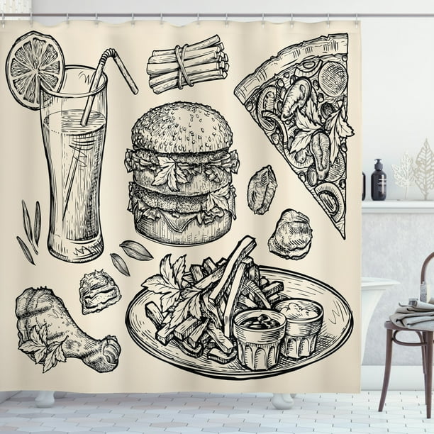 Fast Food Shower Curtain Cheeseburger With Fries Chicken Wings Pizza And Lemonade Cuisine Sketch Art Fabric Bathroom Set With Hooks 69w X 70l Inches Beige And Black By Ambesonne Walmart Com